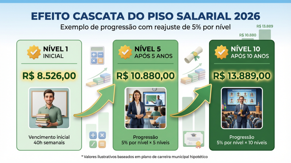 O piso nacional (R$ 8.526,00 para 40h) é o vencimento inicial mínimo da carreira do magistério público (Lei nº 11.738/2008, art. 2º). Isso significa que todos os níveis subsequentes da carreira devem ser reajustados proporcionalmente para manter a hierarquia remuneratória: